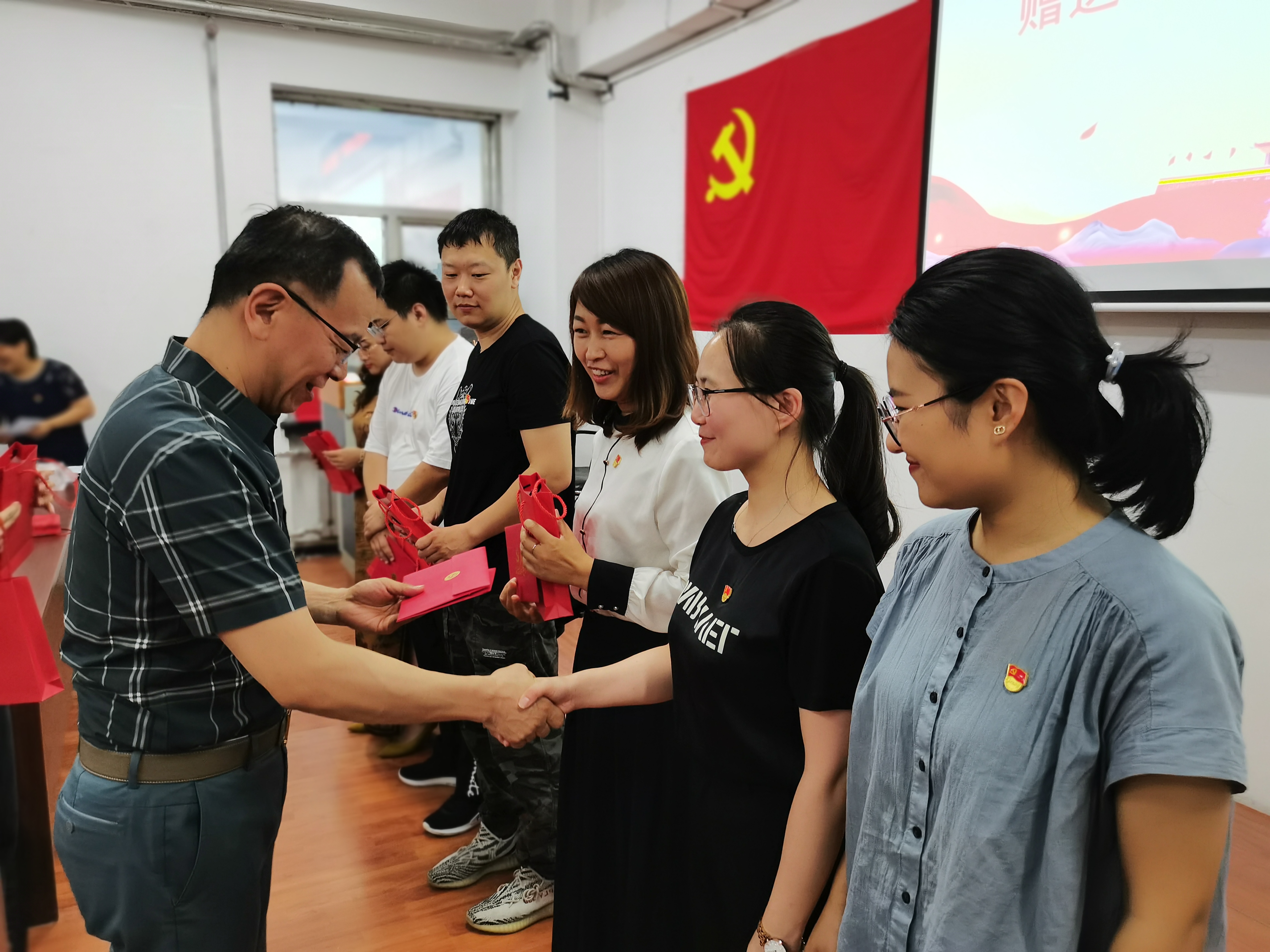 活动中,学院还为部分党员同志过了“政治生日”,由柴文华、李楠明、孙庆斌三位老党员为每一位入党日期为上半年的教师党员赠送了特制的政治生日贺卡和礼物,贺卡上准确地记录着每一位党员的入党日期,在党年龄,时刻提醒大家要牢记党员身份,践行党的初心使命;赠送给党员的签字笔上清晰地印有“为党育人 为国育才”八个大字,寓意全体教师党员将以高度的责任感与使命感落实立德树人根本任务,作育英才,为党和国家培养和输送合格的建设者和接班人。