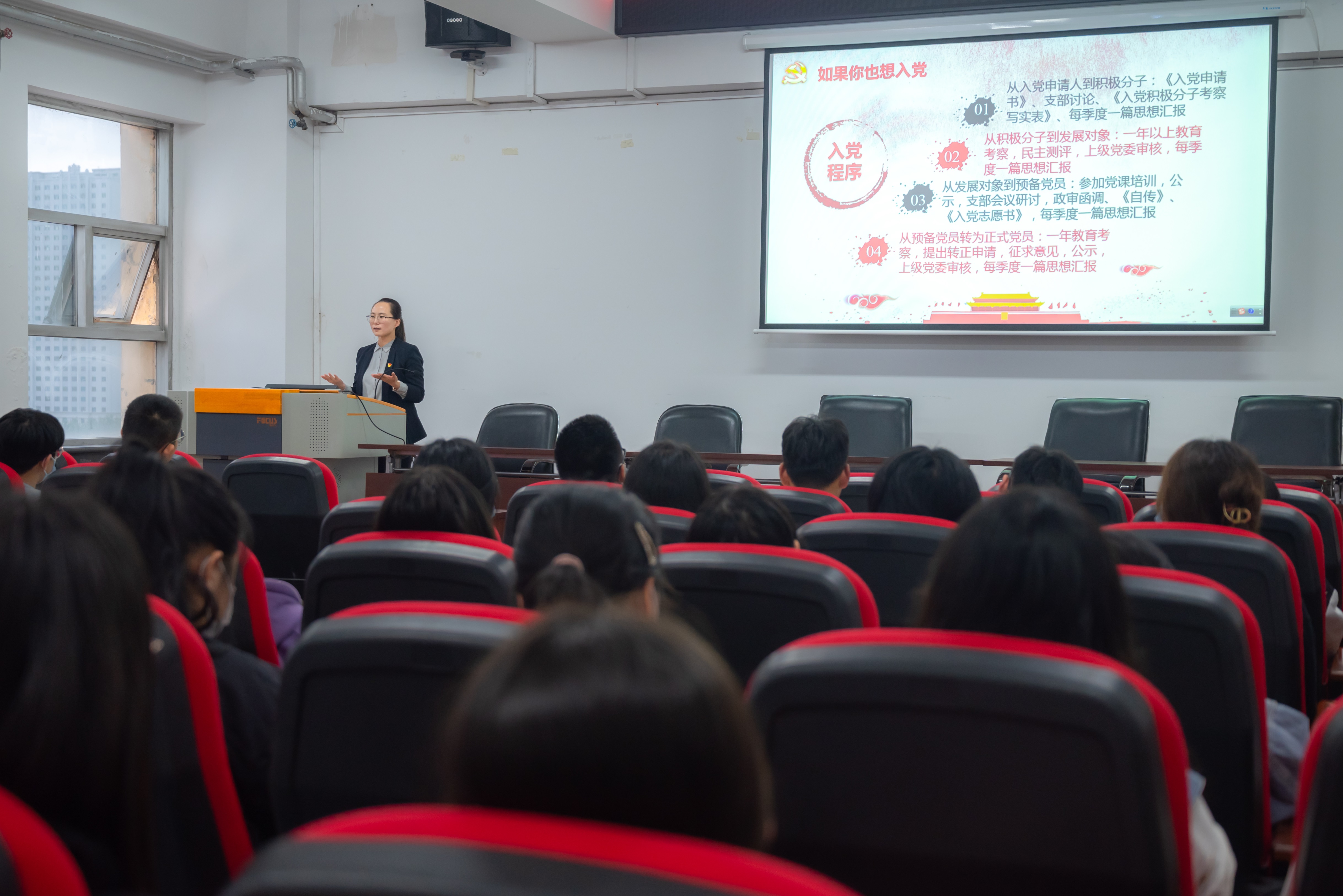 黄老师以《八秩芳华红色传承 坚定理想筑梦未来》为题,向大家介绍了发展党员工作流程,明确了入党申请书、思想汇报等发展党员工作相关材料的书写规范和具体注意事项,解答了同学们在入党具体流程中的困惑,就如何以实际行动争取早日入党向同学提出了建议和期望: