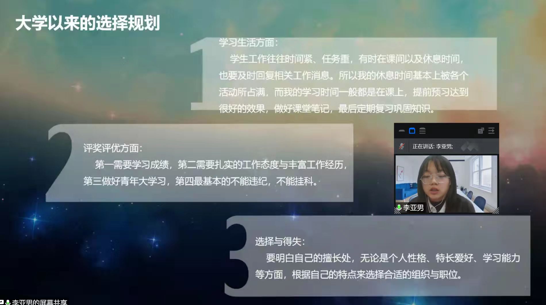 最后,李亚男学姐为大家介绍了自身在参与多项学生工作和社会实践活动的经历。她指出,组织策划学生工作的每一滴汗水和每一滴泪水,既代表着从学姐学长手上接过的接力棒,又代表着老师期望的目光,做学生工作,固然要付出大量的时间精力,但同时也会让我们收获能力,收获友情,坚持这份工作是源于热爱的责任与力量。