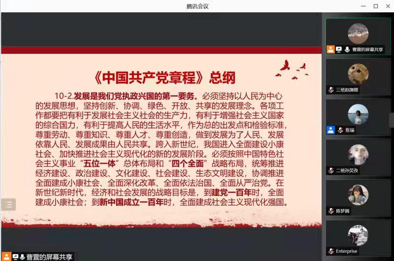 首先,曹萱学长带领同学们了解了《中国共产党章程》的完善发展历程及重要地位。他指出,《中国共产党章程》是中国共产党为实现党的纲领、规定党内事务的根本法规,是党的各级组织和全体党员必须遵守的基本准则和规定,具有最高党法、根本大法的效力。因此,学习《中国共产党章程》是十分重要且必要的。