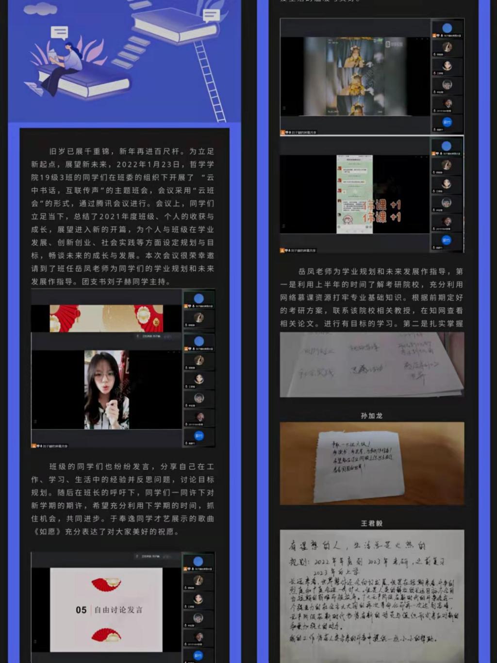 各班级通过腾讯会议举办“云班会”,总结班级、个人的收获与成长,并针对日后的学业发展、创新创业、社会实践等树立目标并作出规划,为学生的成长与发展引航。通过“云中书话,互联传声”的远程方式保持和加强了师生之间的专业互动,发挥线上实时互动的方式,跨越空间障碍,利用“云”技术,实现“云”沟通,助力班级、个人的共同进步与发展,以更好的姿态展望未来。
