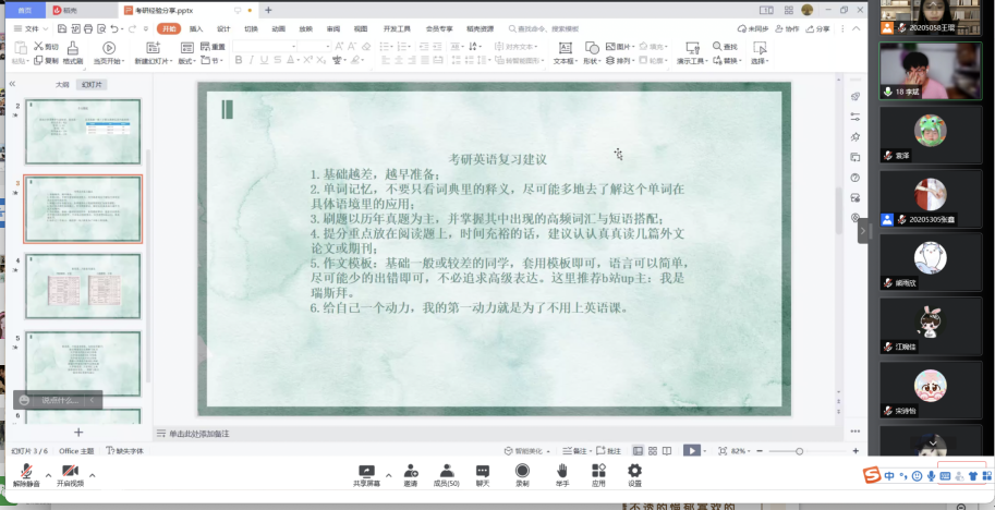 为发扬榜样带头作用,帮助同学树立正确的升学目标,解决和处理在学习过程中遇到的难题,提供更加多样化、系统化的推免和考研经验,哲学学院于2022年5月23日晚八点在腾讯会议召开了推免、考研经验分享交流会。在这次会议中,李斌和蒙延起两位学长为大家分享了他们的经验和心得。