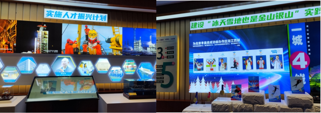 在“习近平总书记黑土情怀”主题教室,以实物展示的形式生动形象讲述了龙江农业发展历程、工业振兴发展历程、冰雪自然资源与奥运健儿的突出贡献,传达了“中国粮仓中国饭碗,推动粮食精深加工,做强绿色食品加工业”、“装备制造业是国之重器,实施人才振兴计划”、“冰天雪地也是金山银山”的思想。