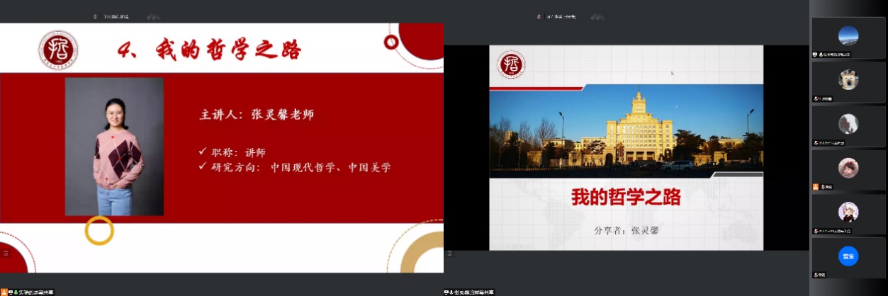 ,讲述了自己从机缘巧合来到黑大学哲学,面对现实与理想的落差,经过本科阶段的学习,在众多学科中选择了中国哲学后一直走在研究中国美学的路上的求学历程。在进入社会面临众多选择时,张灵馨老师表达了她的择业观,即:不以赚钱为目的,更注重自己能不能继续坚持自己所热爱的研究方向,直面客观上的差距和压力,做出自己的选择。张灵馨老师认为目前全国都在发展建设,城市之间的差距没有那么大,也受到家人想建设家乡的影响,选择留在哈尔滨。