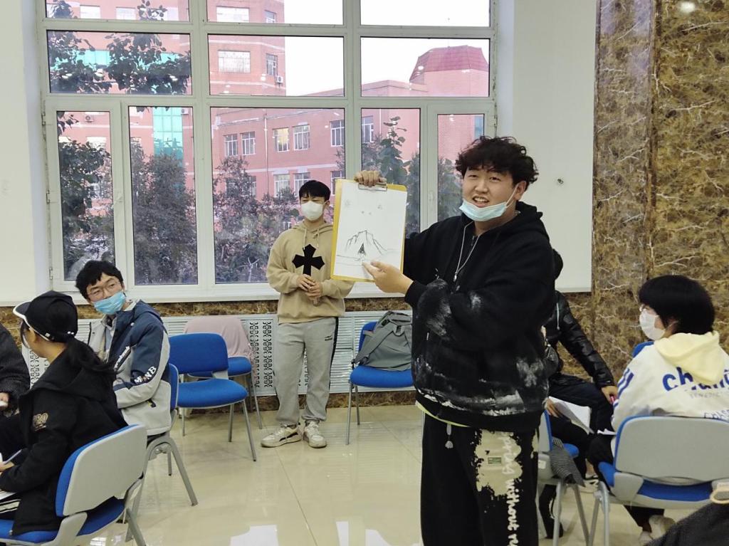 老师将同学们进行简要的分组,同学们以小组为单位进行无交流作画。同组的同学们在未经交流的情况下共同创作一幅画,完成后每个组派一名代表对作品进行介绍。整个活动加深了同学们之间的理解与沟通,增强班级同学间的默契与和谐,提升了班级的凝聚力。