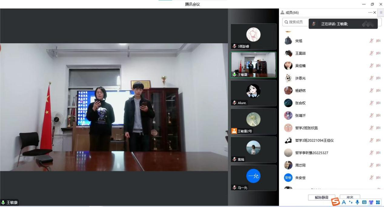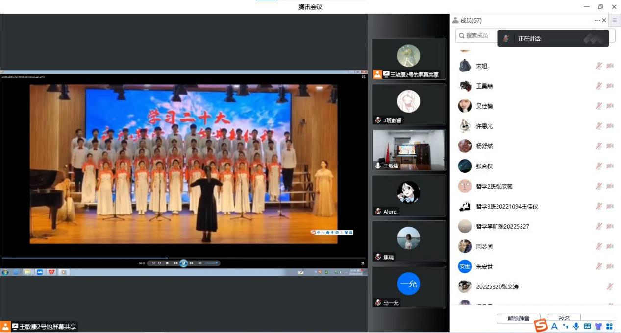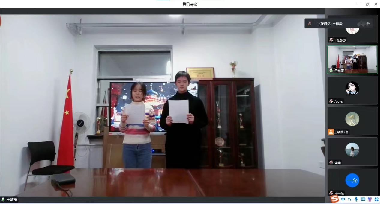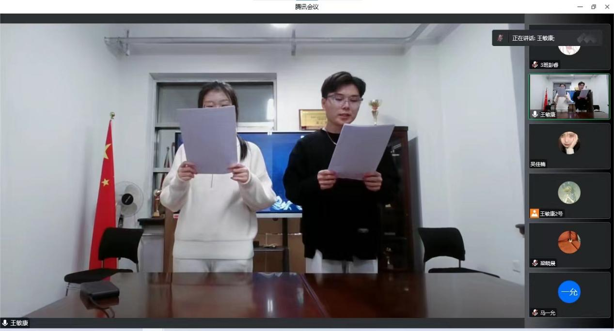 千秋伟业,吾辈青年当自强。随后同学们表演了有关歌颂伟大建党精神、歌颂伟大时代的节目,在主题演讲“请党放心,强国有我”中,李崧源同学以饱满热情的口吻庆祝中国共青团成立一百周年。时代各有不同,青春一脉相承,中国共青团始终与党同心,跟党奋斗。“请党放心,强国有我”成为当代中国青年发自内心的最强音。