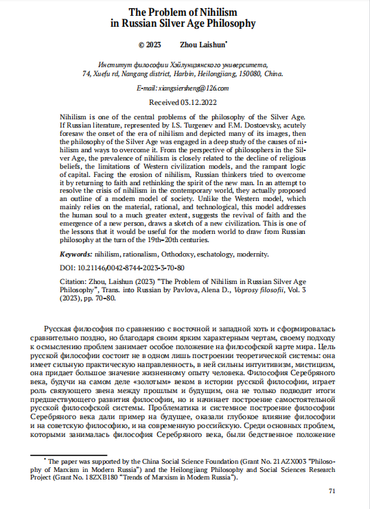 《ВОПРОСЫ ФИЛОСОФИИ》(《哲学问题》)——周来顺《Проблема нигилизма в русской философии Серебряного века》.pdf
