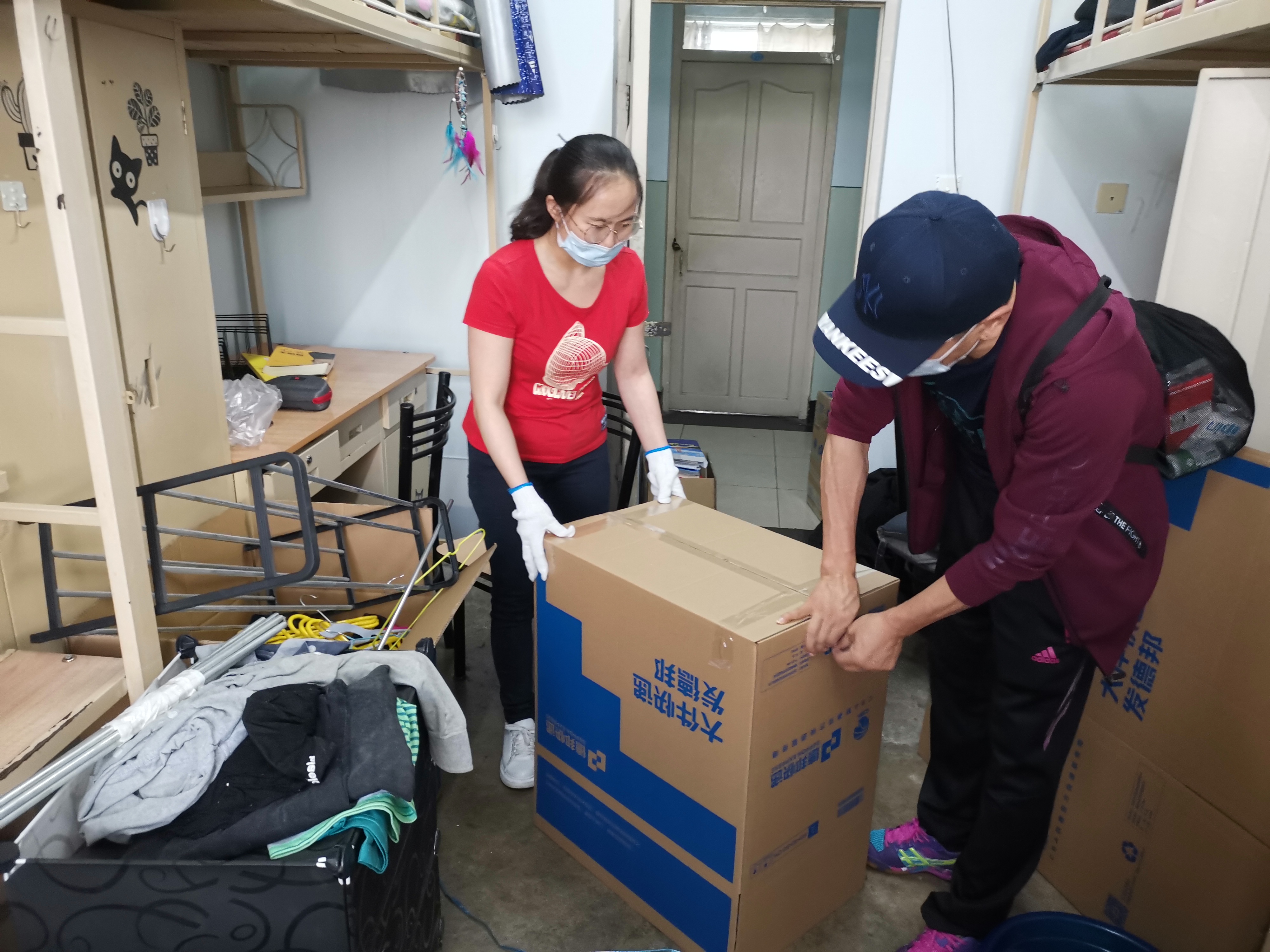 因疫情原因,2020年的毕业季较往年格外不同,性爱视频 的毕业生无法返校,为了帮助学生解决这一现实难题,6月14日学院领导班子带领教师志愿者深入毕业生各个寝室帮助学生收拾寝室,打包托运行李,用爱为毕业生护航远行。