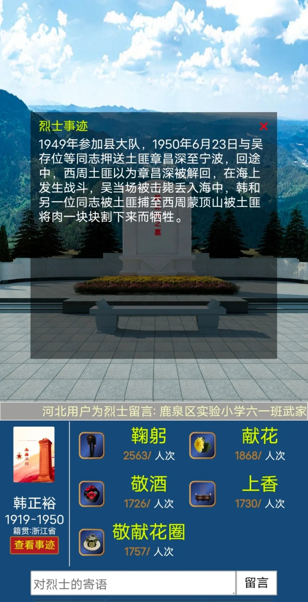 发布“清明网络祭扫英烈”活动倡议,组织全院师生依托“龙江高校网络思政中心”平台,通过“祭英烈”专栏利用鞠躬、献花等方式进行云端祭扫,用更加环保又安全的方式表达哀思。积极响应疫情防控常态化要求,弘扬“感怀先人先烈、感恩亲人”的理念,以文明、环保、节俭、安全的方式寄托思念与缅怀之情。在主题网络祭扫活动中,同学们纷纷留下寄语,学生党员刘浩东表示,要学习革命先烈的英勇事迹,重温先烈们的宝贵精神遗产,激励自己不断努力奋发前行。学生干部温馨表示,要深切表达对先烈们的缅怀之情和崇高敬意,传承红色基因,发扬红色传统。