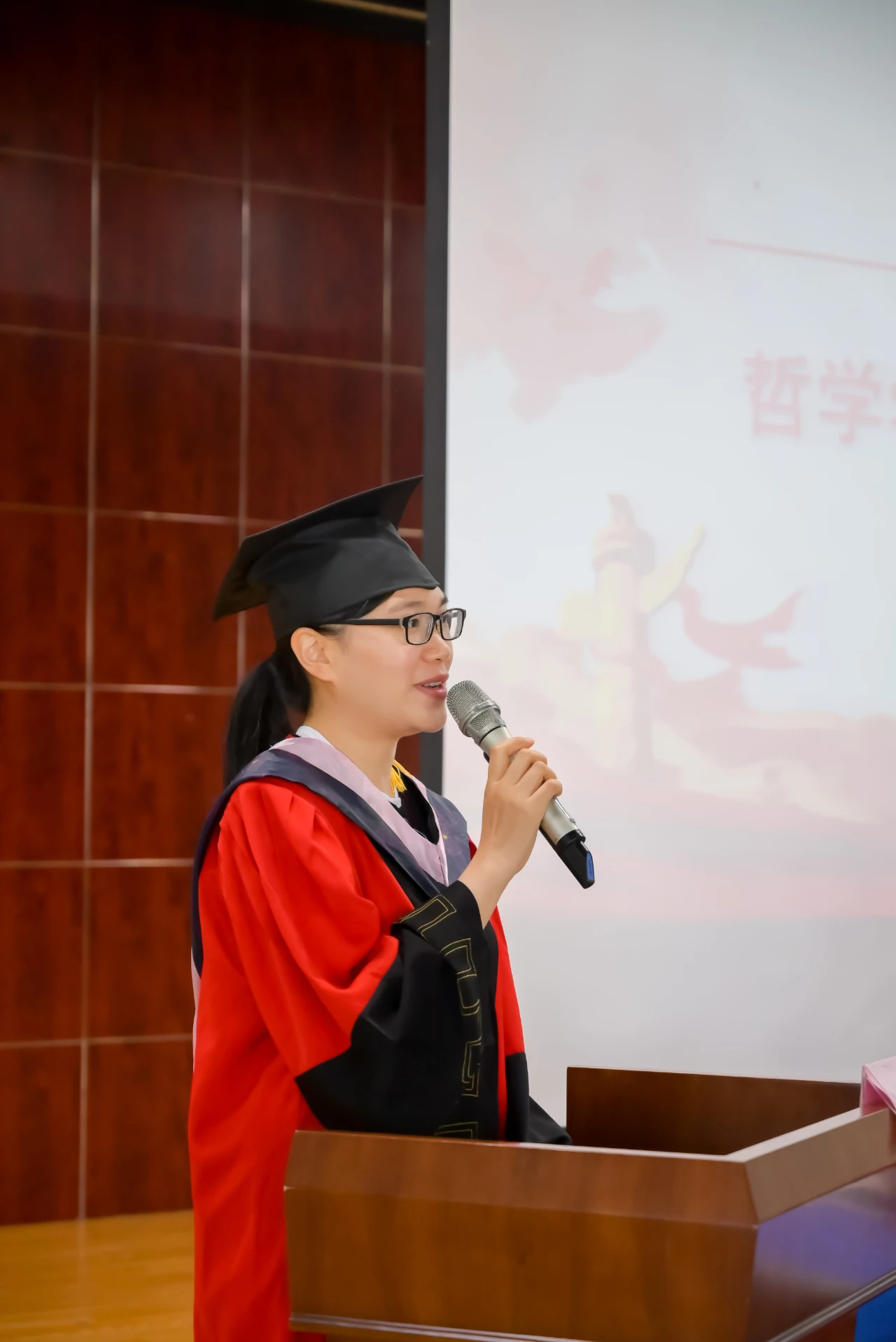 典礼第六项,校友代表2004届哲学专业毕业生、哈尔滨商业大学马克思主义学院副院长郑秋月教授发言。