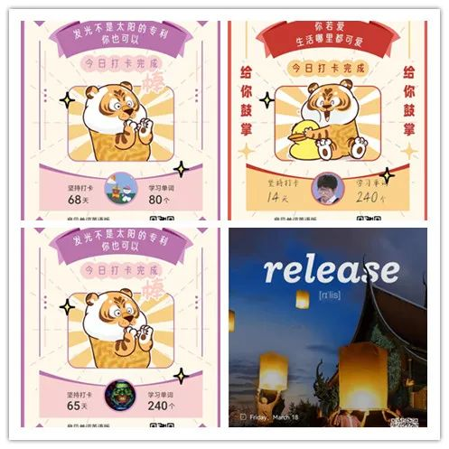 天道酬勤,坚持不懈。同学们在7天内每天坚持通过微信群发送截图的方式进行英语单词打卡。同学们积极地学习英语,充分地利用课余时间,增强自己的自律能力,用一个个单词来记录每天的生活,更好的充实自己,提升自己,通过这种方式,每一位同学都有了不小的收获!让我们一起来看看同学们的精彩表现吧!