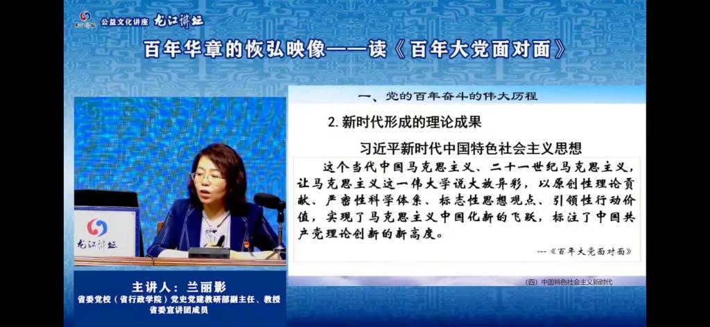 7月26日下午我院全体党员同志听取了省委党校(省行政学院)党史党建教研部副主任、省委宣讲团成员兰丽影教授题为“百年华章的恢弘映像——读《百年大党面对面》”的专题讲座,该讲座以党的百年奋斗的伟大历程、历史意义和成功秘诀三个方面为切入点,重点对百年党史的13个基础性和根本性问题进行了分析和解读,融汇理论和实践、联结历史和现实。在共同学习交流和分享中我院师生围绕讲座内容展开热烈讨论。