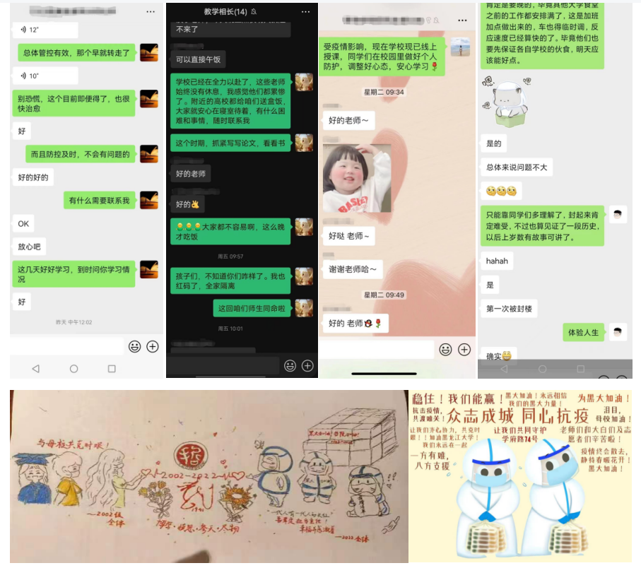 2022级新生黄壁遥、2021级学生印美霖自发采取手绘抗疫海报等形式来丰富全体师生的精神文化生活,展示了黑大哲学人昻扬向上精神面貌,更彰显了疫情无情,黑大有爱,师生戮力同心的坚定信念。