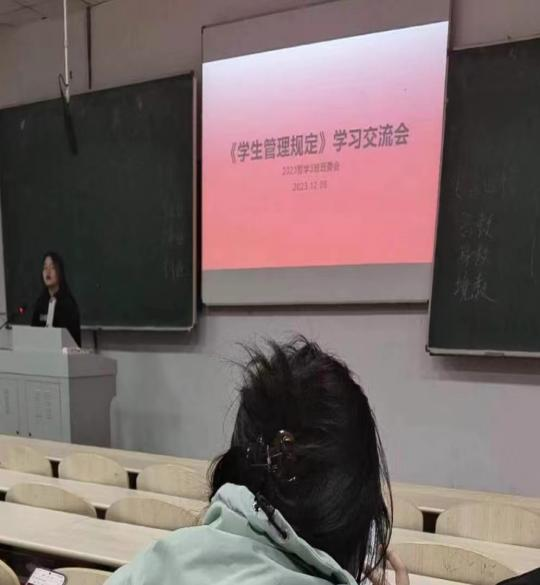 学生管理规定》的主题班会。班会伊始,班长李佳真带领同学们全面系统地学习了学生管理规定。随后,为了深化同学们对规定的认识,由团支书张格语、组织委员陈宇宣、宣传委员葛司婷宣读了相关规定。生活班长林雨萱、薛沂宁和学习委员王晓薇也分别对寝室安全、考风考纪等重点问题作出强调。最后,同学们就选课管理、学分管理等问题进行了广泛的交流和深入的研讨。同学们一致认为,此次班会使大家受益匪浅,不仅增强了安全意识,还树立了诚信考试的观念,同时也深刻认识到应该在课余时间积极参加各类活动,以提升自身的综合素质。