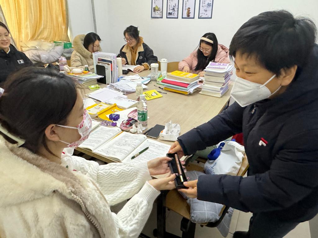 党总支书记孙美晖、副书记王贵宇、2024届毕业年级辅导员张博伦来到图书馆及公寓楼自习室走访看望考研学生,发放“暖心加油文创笔”,送上学院领导老师的关心与祝福。