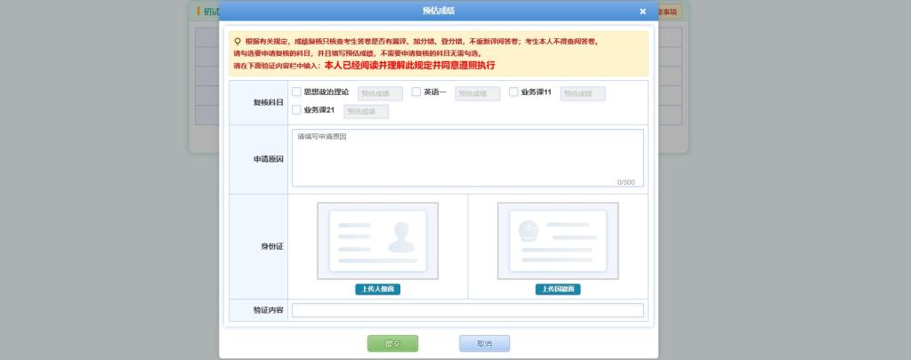 硕士研究生招生服务系统(//yz.xingaivod.net/login_mas.html),填写报名相关信息进行登录,进入“硕士成绩查询”页面,考生在可申请复核的时间段中,若对科目成绩有异议,点击“申请复核”,弹出弹框,在弹窗中,勾选要复核的科目并填写该科目的预估成绩以及申请原因和验证内容,并上传证件照片后,点击“提交”,可申请复核。(注:每名考生只能申请一次复核,所以确认复核前请确认是否勾选所有需复核的科目,并确认身份证信息上传正确,再提交,提交后所有信息均不可再修改,请考生检查上传材料及信息确认无误后提交申请。)
