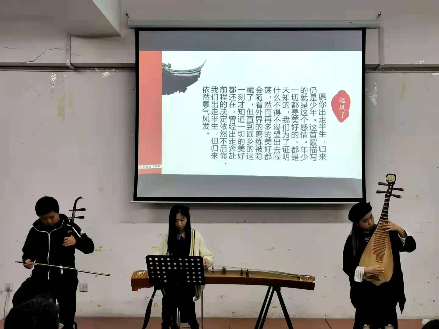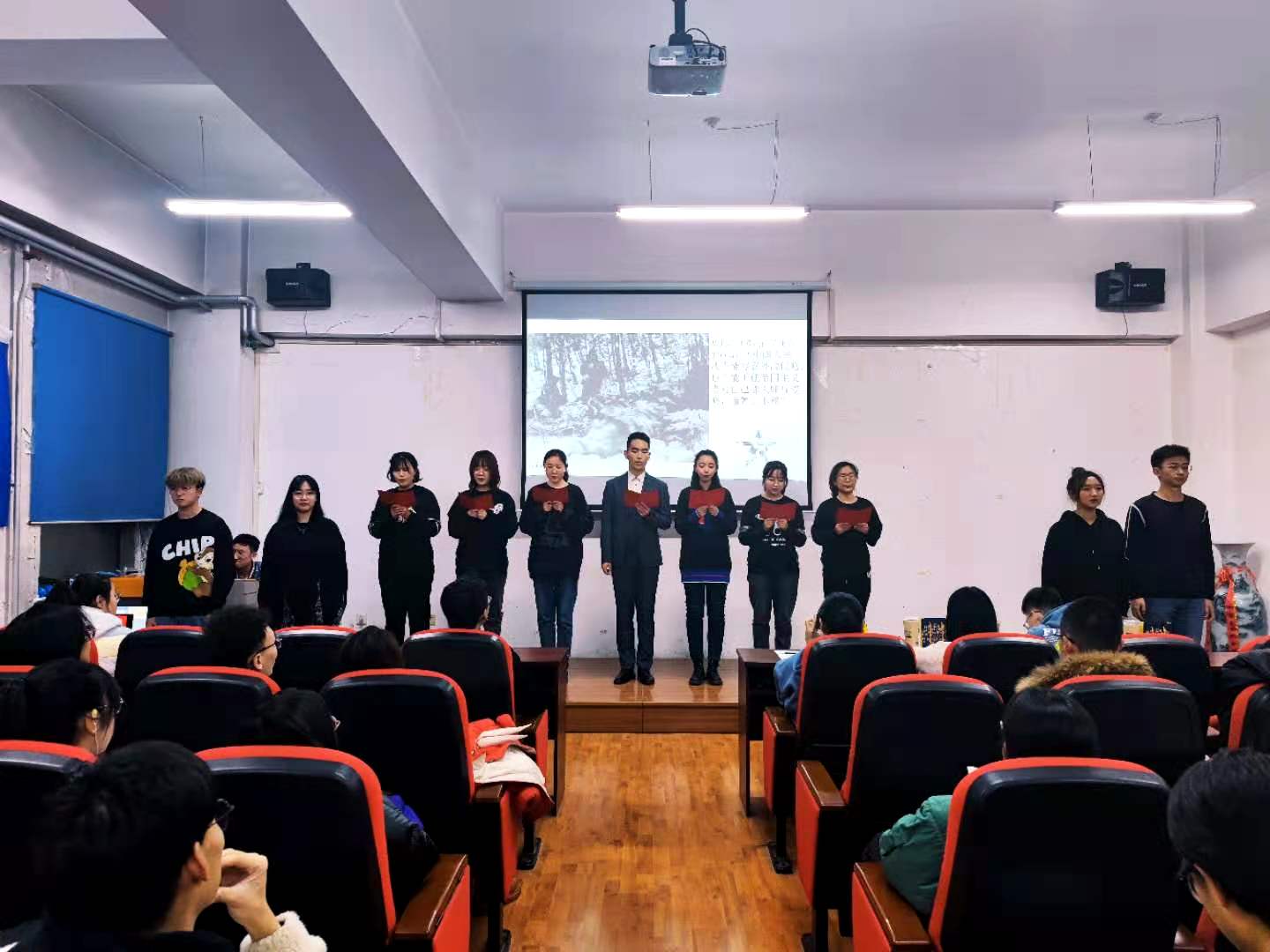 活动伊始,王靖儒、殷晓天同学为我们带来了精彩节目——《蝶变的青春》,这个节目也让在场的同学们感受到了青年人的蓬勃力量。孙上雯同学所带来的《独舞雨莲》,则象征当代青年即使受到风吹雨打,也昂首阔步,坚定不移的走在民族复兴的大道上。由蔡贵帛、王晓蒙、邢睿桐、杨婉秋四位同学带来的集体诗朗诵《抗美援朝——不朽的丰碑》,使大家重温那一段血与火的保家卫国岁月,更彰显出拳拳爱国赤子之心。由高鑫梁、岳新宇、王淼、王媞、吕永航、张苗苗、于潇、孙上雯、高婕菲、殷睿良、刘海嵩团体唱诵的《英雄之花》,歌颂了英雄青年们为了国家与人民奉献自我的精神。由王卓宁、王睿琦同学带来的乐器演奏起风了,古典乐器的声乐之美使现场观众如痴如醉。王可心同学带来的说唱节目《抗疫2020》用充满活力的表达,展现中国抗疫的丰硕成果。孙上雯、高婕菲、殷睿良、刘海嵩四位同学带来的《夜空中最亮的星》,唱出了青年的理想与信念。最后,在《歌唱祖国》的合唱声中,本次活动圆满结束。