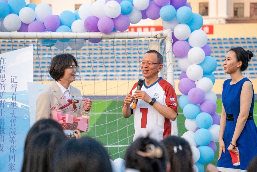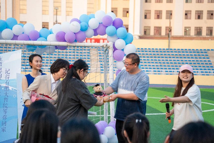 歌会现场,气氛热烈而欢快。学院领导和辅导员化身幸运的使者,在歌会现场随机抽取幸运观众。中奖的同学收获了一个哲学学院专属定制小熊——小熊身穿印着学院院徽的马甲,戴着学士帽,这不仅是萌趣摆件,也是承载四年哲思记忆的时光胶囊。