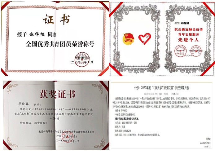 “三下乡”理论宣讲示范项目、优秀团队,2021级中国哲学专业学术硕士研究生赵梓旭荣获全国优秀共青团员、全国抗击新冠肺炎疫情青年志愿服务先进个人、黑龙江省“向上向善好青年”、黑龙江省“青年讲师团”讲师。学院团员青年近年来累计获得国家级、省级、校级学生学术科技创新荣誉近百项。